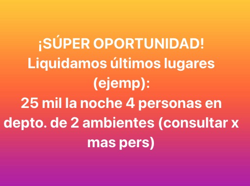– Alquiler mínimo: 4 noches en Temp. Alta (2a de Ene. y 1 de Feb.), 3 Noches en Temp. Baja (1ra Ene. y 2a de Feb.) y Carnaval